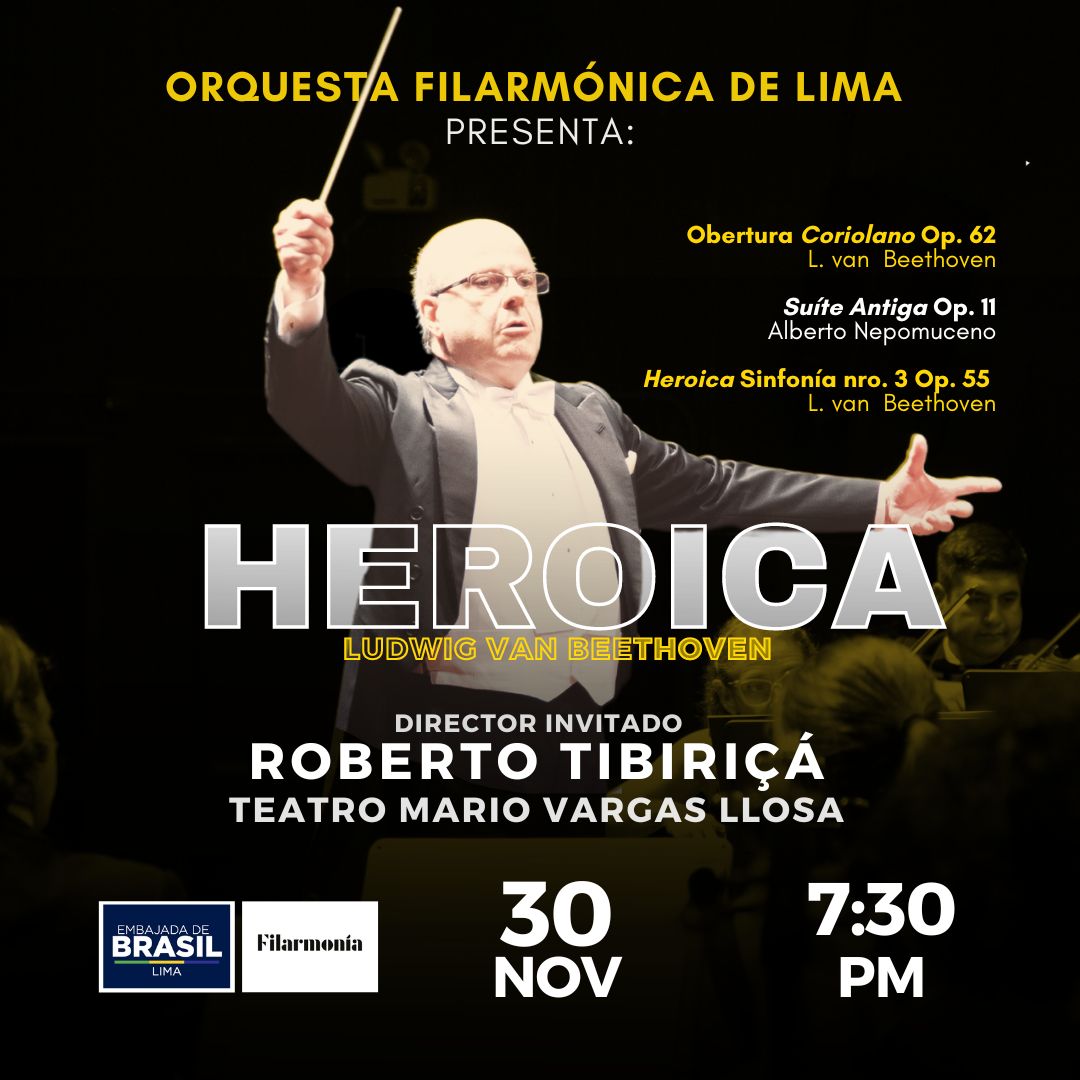 La Orquesta Filarmónica de Lima presenta su quinto concierto de la temporada 2023 con una espectacular presentación de la Sinfonía “Heroica” de Ludwig van Beethoven con la dirección de uno de los directores más destacados de Latinoamérica, Roberto Tibiriçá. La presentación será el 30 de noviembre a las 7:30 p.m. en el Teatro Mario Vargas Llosa. Las entradas están disponibles en Joinnus.