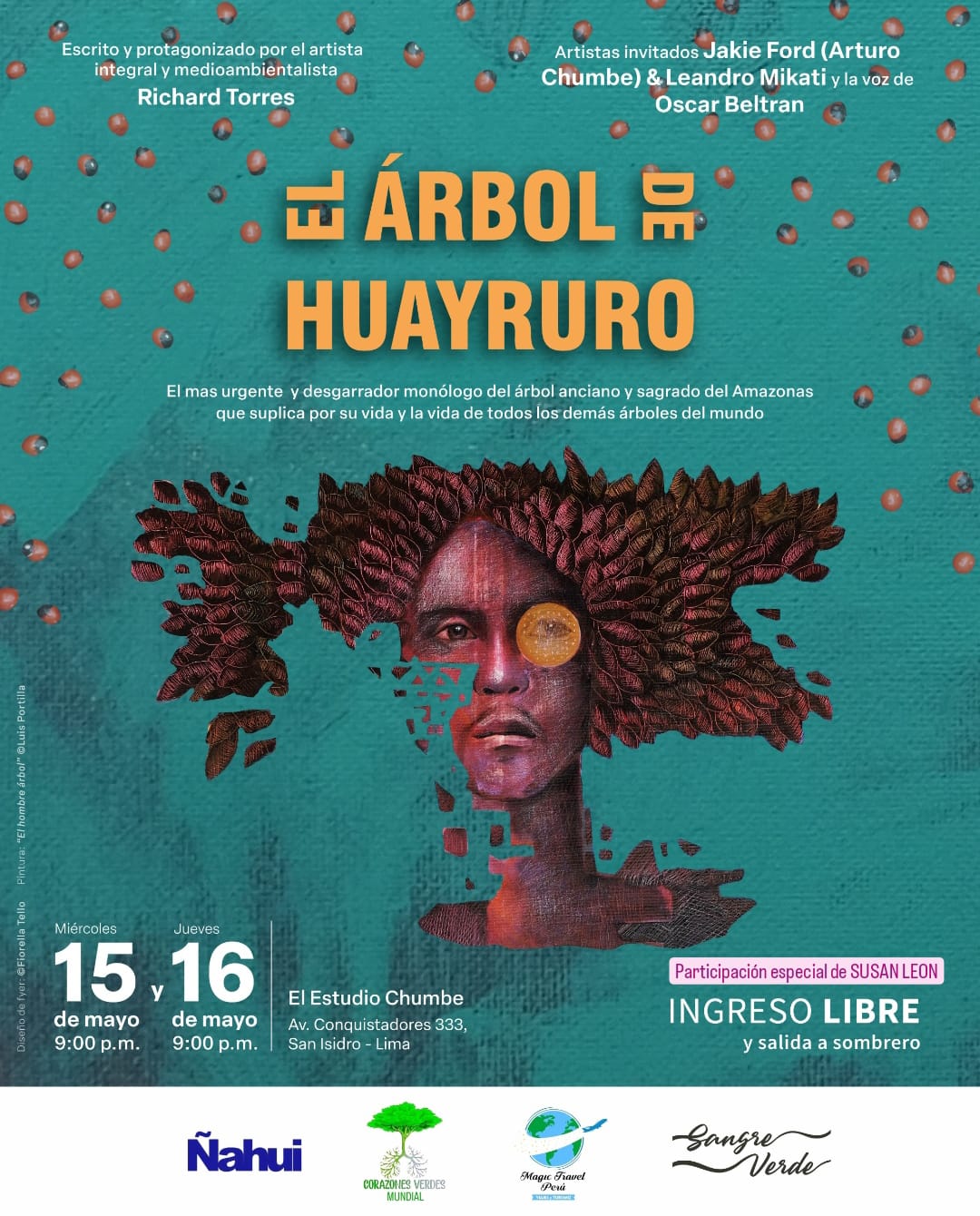 Richard Torres se pone en la piel del Árbol de Huayruro y hace éste contundente llamado, en medio de una dramaturgia de acciones dramáticas, audiovisuales y poéticas, lo acompañan en escena los artistas Arturo Chumbe y Leandro Mikati, la gran voz del actor nacional Oscar Beltrán, Susan León y la artista plástica Martha Quintanilla.