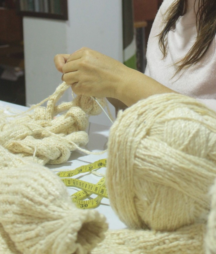 La chompa de mangas largas tiene un diseño único con cuerdas entretejidas y detalles arquitectónicos, simbolizando nuestras conexiones ancestrales. El pantalón, tejido a telar con fibra de kapok y una pretina de tejido de punto, ofrece elegancia y funcionalidad. «EmpowerSelf» brinda a las mujeres una opción moderna y elegante para diversas ocasiones, permitiendo expresar su individualidad y confianza.