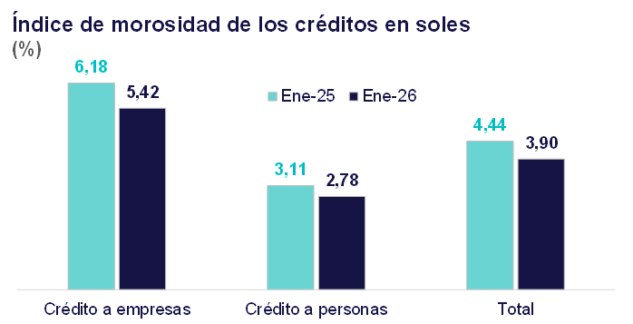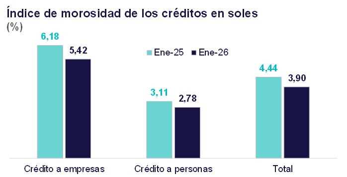 En concordancia con la evolución a la baja de las tasas de interés, la morosidad de los créditos en soles disminuyó de 4,44 por ciento en enero de 2025 a 3,90 por ciento en enero de 2026.
