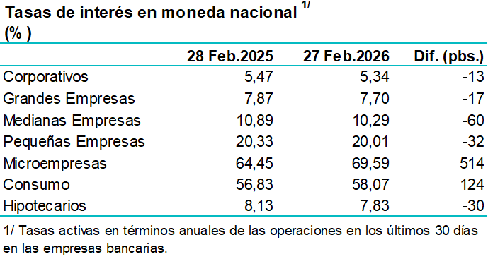 En esa línea, en los últimos 12 meses a febrero de 2026, las tasas de interés de los sectores de grandes, medianas y pequeñas disminuyeron en 17, 60 y 32 puntos básicos, respectivamente. Asimismo, el segmento corporativo, el de menor riesgo crediticio, destacó con una caída de 13 puntos básicos en su tasa de interés.